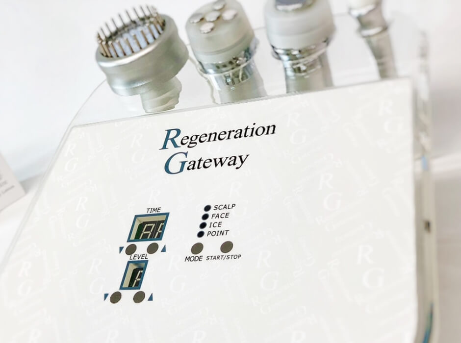 がん治療の研究から生まれたエレクトロポレーションという浸透技術に、温冷調整をして導入できるクライオ技術(40℃~0℃まで調節可能)を組み合わせて、頭皮には高濃度の発毛成分、お顔には高純度の美容成分を肌の奥まで浸透させ、その成分の効果を最大限に発揮させることを可能にした最新の導入技術。